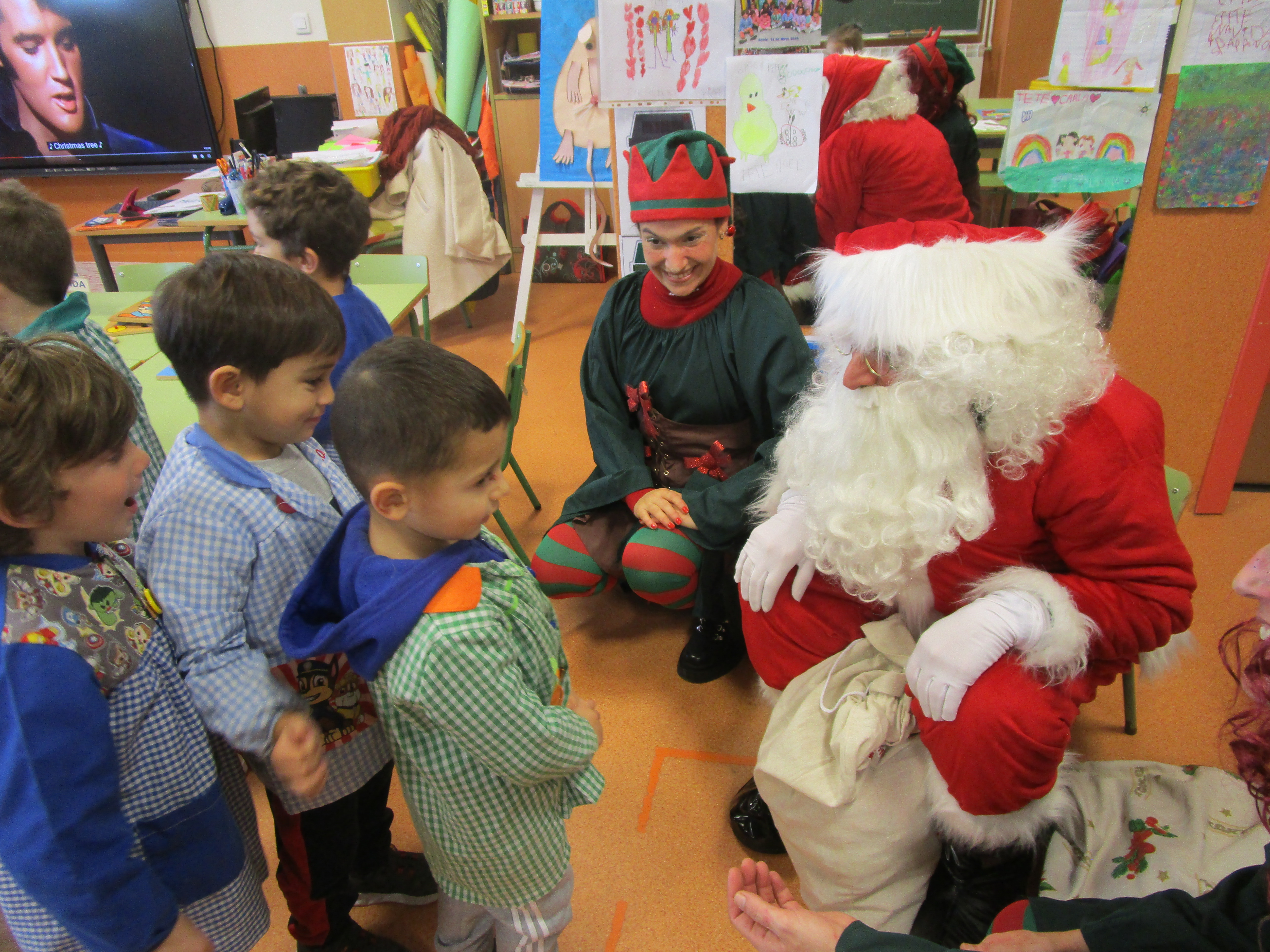 Onte foi un día cheo de emocións xa que tivemos unha sorpresa que nos deixou abraiadas/as. Estábamos tan panchos facendo uns puzles cando unhas elfas misteriosas, chamadas Palmira e Pascuala, apareceron de repente pola porta e empezaron a falar e falar, acontarnos cousas e a dicirnos que estaban acompañando a Papá Noel, e resulta que era verdade. Aos poucos minutos o mesmiño Papá Noel apareceu pola porta e viña tan cheo de enerxía e boas vibracións que se puxo a bailar e a mover o cú que aquelo foi espectacular. E para rematar, agasallou a tosos os nenos e a todas as nenas cunha bolsiña de chuches.¿qué divertido!